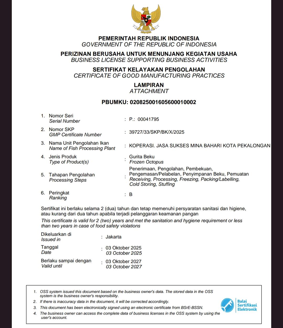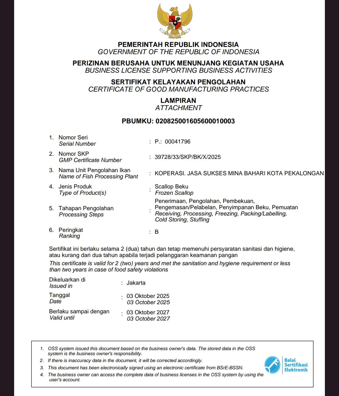 Koperasi berhasil mendapatkan Sertifikat Kelayakan Pengolahan (SKP) untuk produk ikan pelagis, demersal, cumi-cumi, gurita, dan scallop beku.